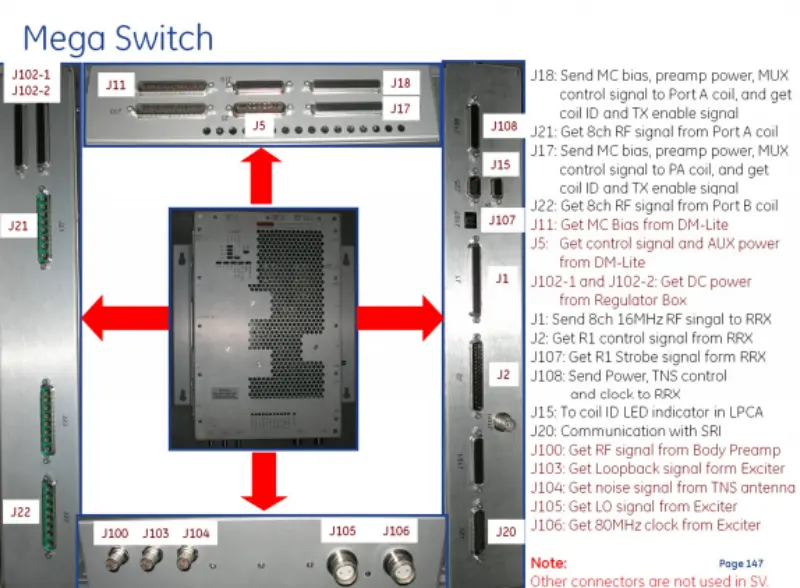 Cumarsáid SRI (J20): Cumasaíonn sé malartú sonraí le hIonchuir Chomhartha Seachtracha SRI (J100, J103-J106): Faigh comharthaí RF ó Body Preamp, comharthaí loopback ó Exciter, comharthaí torainn ó antenna TNS, comharthaí LO, agus clog 80 MHz ó Exciter